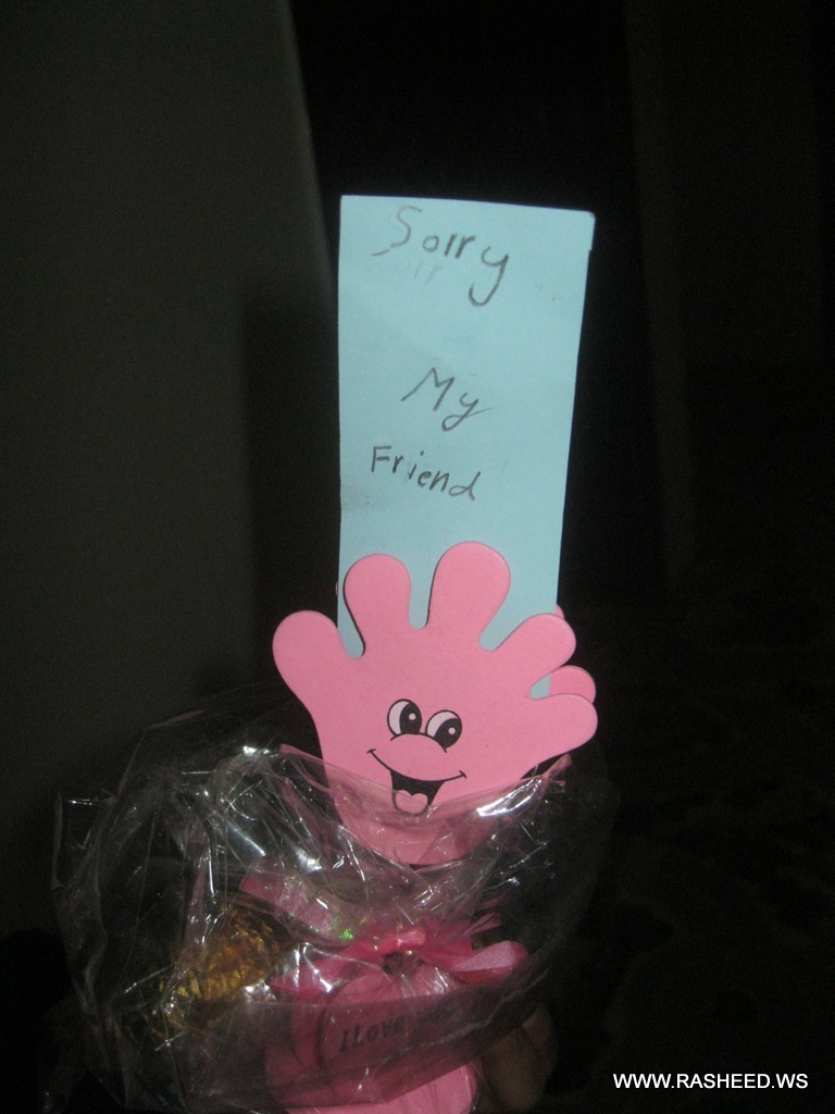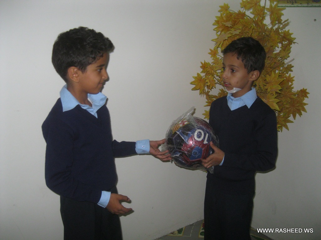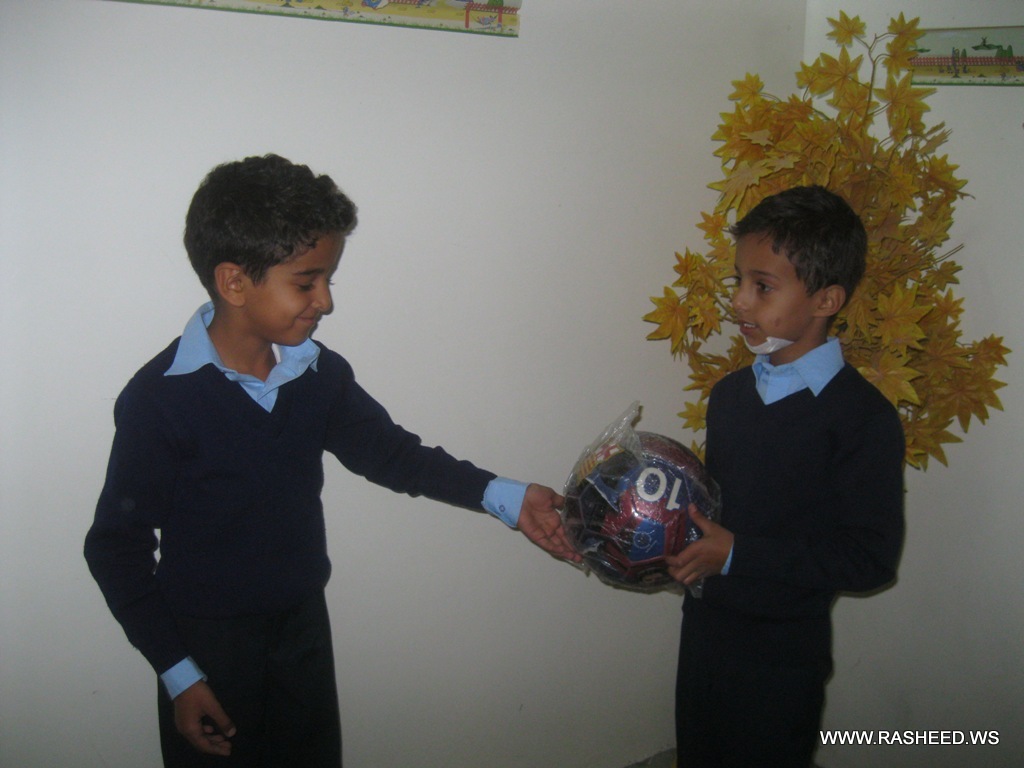 To instill the concept of Aya. And Solh is good the administration of the school helped the students Ahmed Al-Gharasi and Amr Abdulkawi of grade 2 to apologize from the pupil Mohammed Rodhwan of grade 1 and present a gift for him because they caused harm inadvertently. This event was on 7/11/2013.